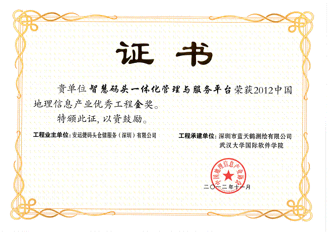 2012中p國地理信息產(chǎn)業(yè)大會暨第七屆海峽兩岸GIS研討會2012年11月28日至2012年12月01日在廣州召開,我司“智慧碼頭一體化管理與服務(wù)平臺”榮獲2012中國地理信息產(chǎn)業(yè)優(yōu)秀工程金獎。